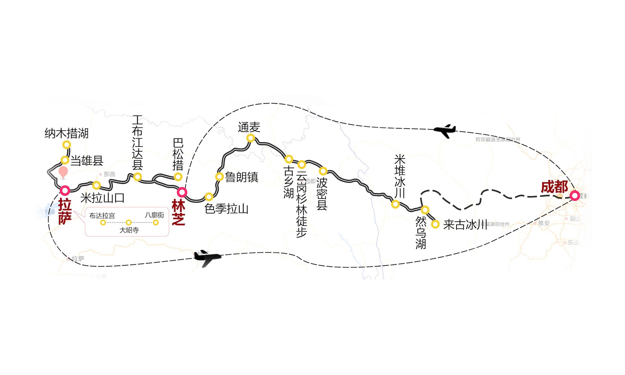 行程线路:成都--林芝--波密--然乌湖--林芝--拉萨